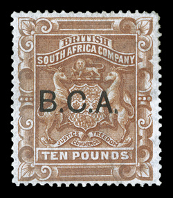 very fine 2009 BPA certificate ex-Dale-Lichtenstein (S.G. 17#17, 1891 £10 Red Brown, with "B.C.A." ovpt., another attractive mint example of this rare stamp, uncharacteristically well centered, rich fresh color, slightly disturbed o.g., very fine; 2009 BPA certificate; ex-Dale-Lichtenstein (S.G. #17; £4,000). (Image) $4,500.00