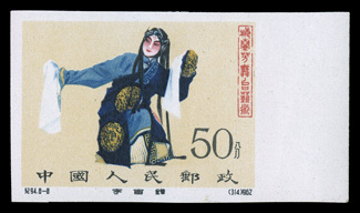 fine.#620-27 Var., 1962 4f-50f Mei Lan-fang imperforate cplt., all but first value with imprint sheet-margins, very fresh white o.g., 4f with spot on gum, n.h., extremely fine. (Image) $3,500.00