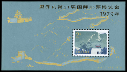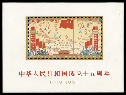 1287 og 798a 798a, 1964 15th Anniversary of P.R.C. souvenir sheet, fresh with untarnished gold, o.g. which is only very slightly disturbed as nearly always, very fine.#798a, 1964 15th Anniversary of P.R.C. souvenir sheet, fresh with untarnished gold, o.g. which is only very slightly disturbed as nearly always, very fine. (Image) $2,100.00