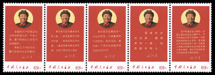 1293 nh 996a 996a, 1968 8f Directives of Chairman Mao strip of five, post office fresh, with strong and unfolded perforations, perfect white o.g., n.h., extremely fine.#996a, 1968 8f Directives of Chairman Mao strip of five, post office fresh, with strong and unfolded perforations, perfect white o.g., n.h., extremely fine. (Image) $3,000.00