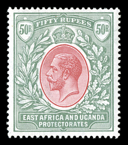 hinged only once, very fine (S.G. 16 £1,600).#16, 1903 50R Orange brown and black, an unusually fresh mint example of this scarce high value, with bright colors on crisp white paper, clean o.g. that has been lightly hinged only once, very fine (S.G. #16; £1,600). (Image) $1,900.00