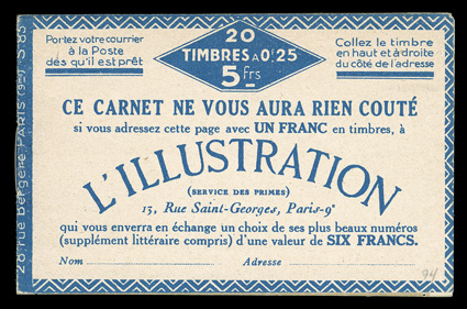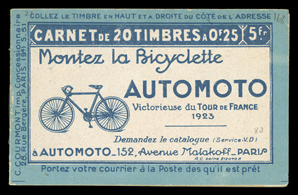 Yvert #140-C 11, 1906 25c Blue, booklet pane of ten, two panes in a complete booklet with Eco Essence advertisement in the selvage (Series 46), fresh and intact, o.g., n.h., very fine and scarce. (Image) |