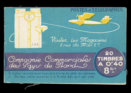 seldom offered and rare booklet.Yvert #188-C1, 1926 10c Green, booklet pane of ten, complete booklet with Mineraline advertisements in selvage and on cover, o.g., n.h., a fresh and very fine example of this seldom offered and rare booklet. (Image) Yvert €5,800