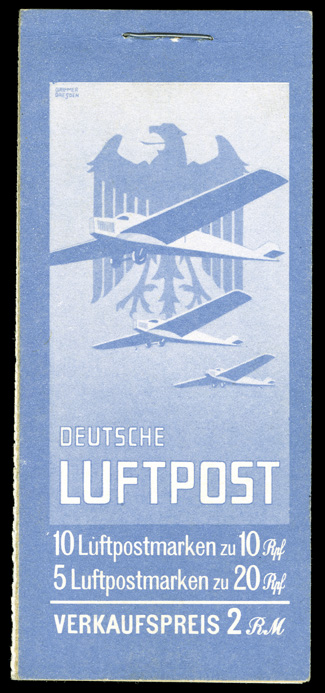 gray blue, each pane followed by a sheet of interleaving with air mailMichel MH #19, 1930 2M Eagle Air Mail complete booklet with ultramarine cover, containing a pane of ten of the 10pf Red and a pane of five plus five X labels of the 20pf Dark gray blue, each pane followed by a sheet of interleaving with air mail information printed on it, stamps are fresh and well centered possessing full unclipped perfs., o.g., n.h., covers are crisp and attractive with only the faintest opening bend, very fine; an exceptionally scarce complete booklet with the first scarce configuration of the 20pf pane. (Image) Michel €1,700