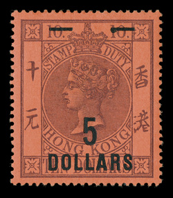 1350 og 60 60, 1891 5DOLLARS surcharge on $10.00 Violet on red Postal Fiscal, fresh and well centered, o.g., very lightly hinged, choice very fine (S.G. F9 £325).#60, 1891 "5/DOLLARS" surcharge on $10.00 Violet on red Postal Fiscal, fresh and well centered, o.g., very lightly hinged, choice very fine (S.G. #F9; £325). (Image) $360.00