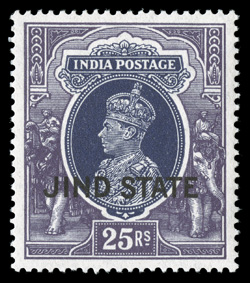1359 og 120-25 120-25, 1927 1R-25R King George V, with Jind State overprint, well centered and uncommonly fresh, o.g., lightly hinged, very fine (S.G. 98-103 £367).#120-25, 1927 1R-25R King George V, with "Jind State" overprint, well centered and uncommonly fresh, o.g., lightly hinged, very fine (S.G. #98-103; £367). (Image) $476.00
