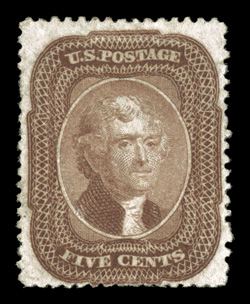 crease at top, very fine appearance 2006 PF certificate.#29, 5c Brown, Ty. I, rarely offered mint single, deeply rich color and a well defined impression, well centered for this, full original gum, lightly hinged, small diagonal crease at top, very fine appearance; 2006 PF certificate. (Image) $5,000.00