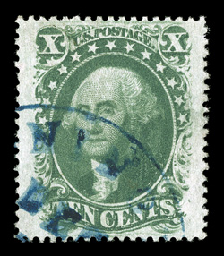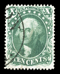 a blue c.d.s., extremely fine gem 1989 PF certificate.#35, 10c Green, Ty. V, an especially handsome used single, featuring enormously wide margins and being remarkably well centered within them, intensely rich color, neat strike of a blue c.d.s., extremely fine gem; 1989 PF certificate. (Image) $70.00