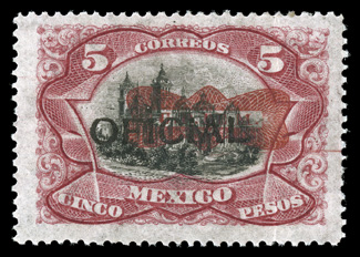 stamps 1952 PF and 1988 Mepsi certificates.#O112, 1916 5P Carmine and black official, rich bright colors, o.g., relatively lightly hinged, very fine; an attractive example of one of the rarest of all the Mexican official stamps; 1952 PF and 1988 Mepsi certificates. (Image) $3,250.00