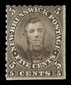 (Unitrade C$7,500.00).#5, 1860 5c Brown Connell, a presentable example of this rare unissued stamp, scissor separated with perforations on two sides, part original gum, fine; 1957 BPA certificate (Unitrade C$7,500.00). (Image) $12,000.00