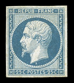 very fine and scarce signed A. Brun and A. Diena (Yvert 15 Ç2,800#17, 1853 25c Blue on bluish, Ty. I, attractive mint single, with luxuriant color and a prooflike impression on fresh paper, mostly large margins to quite ample at bottom, o.g., very fine and scarce; signed A. Brun and A. Diena (Yvert #15; €2,800). (Image) $2,300.00
