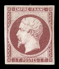 uncommonly fresh paper, four large margins, full original gum, small h.#21, 1853 1Fr Lake on yellowish, an especially desirable mint example of this very scarce and difficult high value, with characteristic intense color and strong impression on uncommonly fresh paper, four large margins, full original gum, small h.r., choice very fine; certainly one of the nicer mint copies available; signed A. Diena and accompanied by his 1971 certificate (Yvert #18; €8,000). (Image) $8,000.00