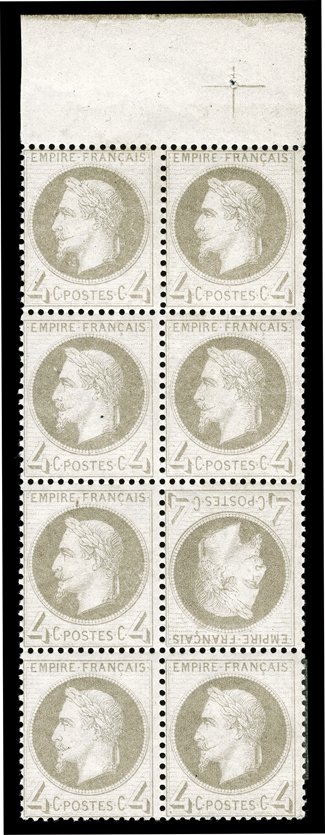 incredibly fresh, with strong and intact perforations throughout, pr#31a, 1863 4c Gray, tete-beche, a truly amazing top sheet-margin mint block of eight (2x4) showing the guide cross in the selvage, position six in the block the inverted cliche, incredibly fresh, with strong and intact perforations throughout, pristine o.g., except the bottom left stamp with a narrow reinforcement h.r. at right, remarkably the other seven stamps, including the tete-beche pair are all never hinged, very fine.A magnificent and highly exhibitable tete-beche multiple in the finest possible condition. The inverted cliche comes only from position 25 on pane two.Illustrated in the 2000 Yvert Specialized catalog. Signed Bernard and Pascal Behr, J.F. Brun, Calves and Goebel, as well as being accompanied by 2003 Behr, Brun and Goebel certificates; ex-"Lafayette" (Yvert #27c; €29,970+) (Image) for hinged $21,200.00+