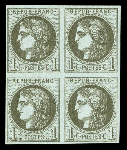 lightly hinged, very fine ex-Derby (Yvert 39C Ç750).#38, 1870 1c Olive green on pale blue, Die 3, handsome mint block of four, ample to mostly large margins all around, luxuriant color on fresh paper, o.g., bottom pair very lightly hinged, very fine; ex-"Derby" (Yvert #39C; €750). (Image) for singles $640.00