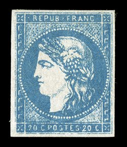 even margins all around, deep rich color and distinctive impression#43, 1870 20c Blue on bluish, Ty. I, Die 2, a magnificent mint example of this Bordeaux issue rarity, being in a quality with which few other copies can compare, possessing large even margins all around, deep rich color and distinctive impression on particularly fresh paper, and full clean original gum which has only been lightly hinged, choice very fine; the finest mint example of this sought-after rarity that we have ever had the pleasure to offer in our auctions; signed Friedl and accompanied by 1998 von der Weid certificate (Yvert #44Ba; €32,000). (Image) $22,000.00