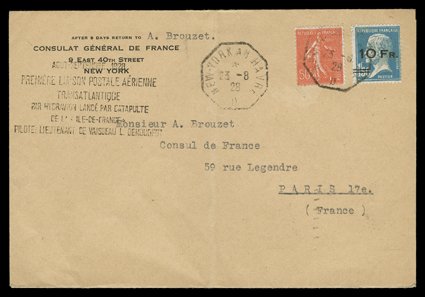buff cover to Pairs, France, full strike of postmark repeated at#C4, 1928 10Fr on 1.50Fr "Ile de France" air post, single tied along with 50c Sower (#146) by partial strike of octagonal "New-York au Havre/23.8/28" first day of issue datestamp to buff cover to Pairs, France, full strike of postmark repeated at left, well struck six line catapult cachet, backstamped at Paris on the same day, cover with a harmless vertical pocket fold at center, very fine; only 250 of the 10Fr on 1.50Fr surcharge stamps were flown; ex-"Derby" (Yvert #PA4; €12,500 for used).In an effort to accelerate the mail crossing the Atlantic, the French passenger liner "Ile de France" was fitted with a catapult to launch a mail hydroplane towards its destination while the ship was still five or six hundred miles out to sea. As a result, the mail arrived over 24 hours earlier than if it had remained on board the ship. The stamps received their surcharge in New York by order of the Consul General and were used to pay the 10Fr catapult fee. In all, 2,700 90c stamps and 900 1.50Fr stamps were surcharged. (Image) $10,500.00