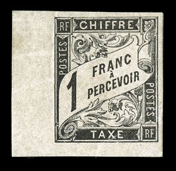 paper, extremely fine a very attractive example of this elusive stamp#J1, 1859 10c Black, an especially handsome unused example of this rare postage due stamp, featuring large to huge margins all around, strong color on particularly fresh white paper, extremely fine; a very attractive example of this elusive stamp which is almost never found retaining its original gum; signed Calves and others, as well as being accompanied by 1987 Renon certificate (Yvert #TT1; €7,500). (Image) $7,250.00