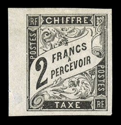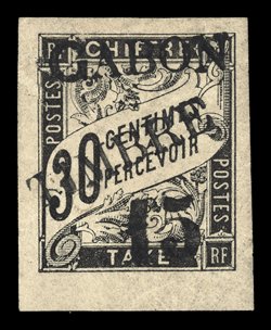 partial sheet-margin at bottom, but also being one of the few exampl#12, 1889 "Timbre 15" Surcharge on 30c Black postage due, an eye-catching mint example of this very rare stamp, featuring not only lavishly large margins all around, including a partial sheet-margin at bottom, but also being one of the few examples that still retain its full original gum, intense color on uncommonly fresh paper, o.g., extremely fine and choice; seldom found in any condition, let alone in this gem quality; while 250 stamps were issued most were used and lost to philately; signed Calves and Senf, as well as being accompanied by a 1999 Behr certificate; ex-Gibralter (Yvert #12; €5,800). (Image) $5,000.00
