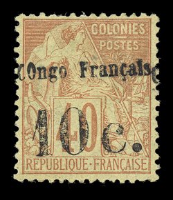 surcharge impression, extremely fine mentioned in Scott as a footno#3 var., 1888 Unissued "5" surcharge on 2c brown on buff, without gum as prepared, incredibly well centered within balanced margins, rich fresh colors on crisp white paper, bold surcharge impression, extremely fine; mentioned in Scott as a footnote below #9; a magnificent example of this major French Colonies rarity, this being the finest example we have ever had the pleasure to offer; signed Calves and accompanied by a 1997 Behr certificate; ex-Gibralter (Yvert #3; €8,700). (Image) $7,000.00