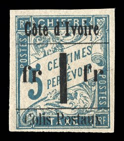 original gum, lightly hinged, very fine a stamp that is missing from#Q14, 1903 "fr 1 fr" Surcharge on 5c Blue, Ty. IV ovpt., an exciting mint example of this great Parcel Post rarity, four ample to mostly large margins, rich fresh color, full original gum, lightly hinged, very fine; a stamp that is missing from even the most advanced collections of French Colonies; signed A. Brun and Miro, as well as being accompanied by a 1996 Behr certificate; ex-Gibralter (Yvert #CP7c; €14,000). (Image) $10,750.00