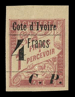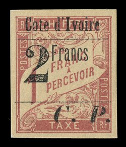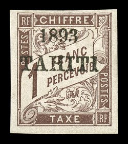 margin, all but 15c o.g., h.r., 4c crease and 10c thinned spots, o#J15-26, 1893 2c-2Fr Postage dues, with "1893/Tahiti" ovpts., cplt. but for the rare 1c value, each with ample to mostly large margins all around, including 30c and 40c with sheet margin, all but 15c o.g., h.r., 4c crease and 10c thinned spots, otherwise generally very fine, most signed by French experts (mainly Calves); ex-Gibralter (Yvert #T15-25; €7,800). (imagea) (Image) $6,600.00