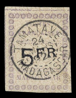 centrally struck Tomatave24 Mar 92 datestamp, very fine and choice#13, 1891 5Fr Violet and black on lilac, an attractive and completely sound used example of this scarce high value, large margins all around, strong color on fresh paper, neat centrally struck "Tomatave/24 Mar 92" datestamp, very fine and choice; most used examples of this stamp are thinned or otherwise faulty due the the softness of the paper, so to find a sound used copy such as this is rare indeed; only 1,000 stamps were printed; signed A. Brun and accompanied by 2000 Behr certificate; ex-Gibralter (Yvert #13; €1,400). (Image) $1,000.00