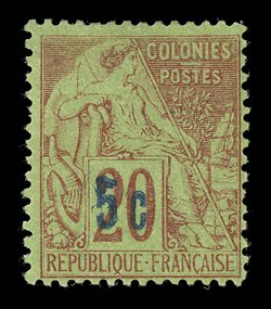manuscript surcharge, strong color on fresh white paper, clear 18#22B, 1895 "0.15" Red manuscript surcharge on 1F Bronze green on straw, Majunga provisional, a pleasing example of this very rare provisional surcharge which only exists used, bold manuscript surcharge, strong color on fresh white paper, clear 1895 c.d.s., fine; one of the nicer examples among the scant few extant; signed Calves and Roumet (Yvert #2; €7,300). (Image) $5,250.00