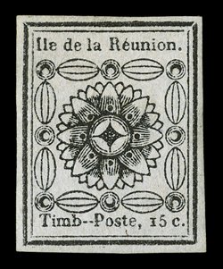 margins all around, crisp detailed impression on light pale blue paper#1, 1852 15c Black on blue, without gum as issued, a most impressive mint example of this great classic rarity, in far better condition than is often found, with generous even margins all around, crisp detailed impression on light pale blue paper, although it has two small thins that are not noted on the certificate, it is still superior to most, as the majority of these stamps are quite faulty or repaired due to thin tissue paper upon which these were printed, extremely fine appearance.A desirable mint example of this rare first issue. This stamp, and the corresponding 30c value, were printed at St. Denis as there were no 15c or 30c General French Colony stamps available to fulfill the 15c and 30c local rates and the 45c rate to France. However, the stamps proved unpopular with the local population, in part because they lacked gum. Few were actually used and only a tiny number of mint examples were retained.Signed J.F. Brun and accompanied by a clear 2000 Behr certificate; ex-Gibralter (Yvert #1; €42,000). (Image) $36,000.00