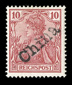 being and accompanied by a 1995 Jakubek certificate (Michel 10 Ç1,20#19, 1900 10pf Carmine, with diagonal "China" handstamped overprint, rich color, o.g., small h.r., very fine and scarce; signed W. Brandes, Champion and Dr. Oertel, as well as being and accompanied by a 1995 Jakubek certificate (Michel #10; €1,200). (Image) $900.00