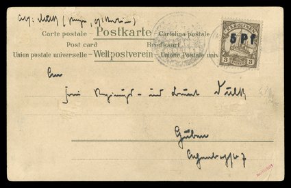 Ponape, (Karolinen)12.710 first day of issue datestamp, with ligh#20, 1910 3pf Brown, with "5 Pf" handstamped provisional surcharge, excellent centering and fresh color, tied to handsome multicolored Gruss aus Jaluit picture post card by "Ponape, (Karolinen)/12.7/10" first day of issue datestamp, with light strike of negative "Kaiserlich Deutsche Postagentur/Ponape/Karolinen" postmark alongside, addressed to Guben, Germany without an arrival postmark, minor bend to card at bottom right, very fine and quite scarce; signed Rappaporte and Jakubek, with the latter's 1995 opinion (Michel #7 Pv; €6,000). (Image) $5,500.00