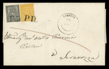 to being a mixed issue usage, the stamps are neatly tied by two stri#2, 6, 1852 5c Black on yellow and 1854 5c Orange yellow, mixed issue franking, a very pretty 1855 folded cover that shows many interesting facets of postal history, in addition to being a mixed issue usage, the stamps are neatly tied by two strikes of "P.D." handstamps of Bagnone, with a large double circle 25 September datestamp of that city at right and backstamped at Seravezza, another interesting feature of this cover is that it has been disinfected, with three neat disinfection slits that in no way affect the stamps or postal markings, the condition of the cover is excellent, both stamps feature large even margins all around and both the stamps and cover are very fresh and attractive, an extremely fine cover of considerable rarity; 1993 Raybaudi "Gold" certificate; ex-Perera (Sassone #2, 6). (Image) Est. $3,000-4,000