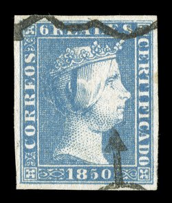 attractive signed Richter and another (Edifil 4 Ç1,000).#4, 1850 6R Blue, select used example, uniformly large even margins all around, bright and fresh, neat "spider" cancellations that are nearly face free, extremely fine and attractive; signed Richter and another (Edifil #4; €1,000). (Image) $850.00