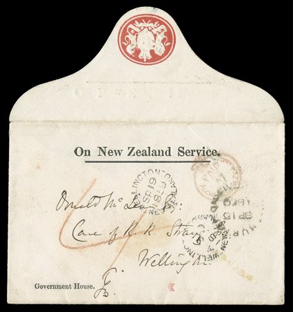 Auckland to Donald Maclean, Native Secretary and Chief Land Pur1859 (27 Aug.) "On New Zealand Service", "Government Service" crested envelope from Col. (later Sir.) Thomas Browne (initials in lower left corner), 4th. Governor of New Zealand, Auckland to Donald Maclean, Native Secretary and Chief Land Purchase Commissioner, Wellington, rated "4" and showing "paid/at/auckland new zealand" Crowned Circle h.s., Wellington c.d.s. (31.8 and 19.9) and Ahuriri (15.9) c.d.s., all on face, despatch c.d.s. on reverse. provenance: "Kiwi", 1990 (Image) Est. $500-750