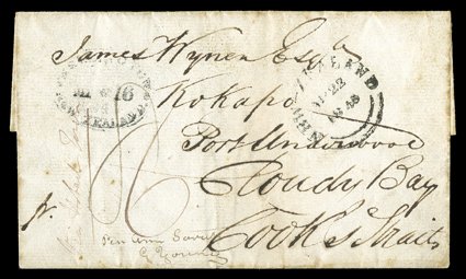 new-zealand double-arc d.s. (23.4) and well1845 (1 Feb.) entire from Adelaide, South Australia "per Ann Sarup G Young" "via Hobart Town" to "Kokapo Port Underwood Cloudy Bay Cook Strait", rated "6" and "8" and showing "new-zealand" double-arc d.s. (23.4) and "wellington/new zealand" oval d.s. (16.5), the reverse with a fair strike of the "general post office/adelaide" Crowned oval d.s. across join. provenance: Harry Lacoste Bartrop, 1984 (Image) Est. $500-750