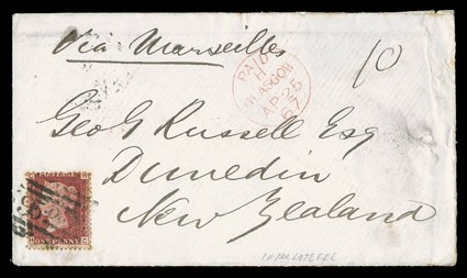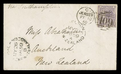 (13.10) below, 1859 (10 Feb.) envelope from Jersey Via Southamp1856 (6 June) front and part back "Per Australian Mail" from Bath to Auckland, bearing 1d. LC14 on blued paper strip of six cancelled with "53" sideways duplex, arrival c.d.s. (13.10) below, 1859 (10 Feb.) envelope from Jersey "Via Southampton" to Auckland, bearing 1855-57 6d. with "409" duplex and showing Nelson (21.5) and Auckland (26.5) c.d.s., and 1867 envelope from Glasgow "Via Marseilles" to Dunedin, rated "10" with Paid c.d.s. in red and bearing 1d. red, cancelled "159" added for Late Fee. (imagea) (imageb) (Image) Est. $200-300