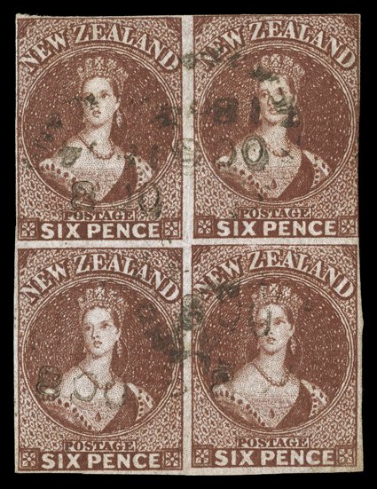 provenance: H Gordon Kaye, April 19916d. red-brown, a block of four with good to large margins mainly all round, most unusually cancelled with 1864 datestamps; a rare and attractive multiple. Sc. 14; S.G. 43. provenance: H Gordon Kaye, April 1991 (Image) Est. $1,000-1,500