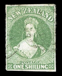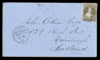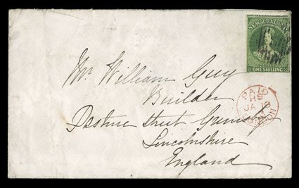 numeral cancellation and showing London Paid c.d.s. (18.1) below, despatch a1862 (28 Oct.) ½oz.-1oz. envelope from Auckland to England, bearing 1/- deep green with good to very large margins and showing portion of adjoining stamp at top, tied by numeral cancellation and showing London Paid c.d.s. (18.1) below, despatch and arrival (19.1) c.d.s. on reverse; the envelope with a few small faults though a fine 1/- adhesive. Sc. 15d; S.G. 46. (Image) Est. $1,000-1,500
