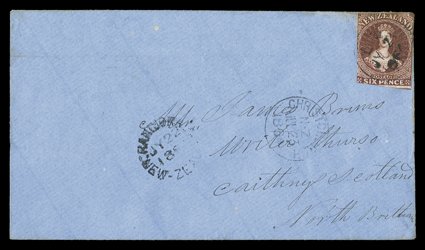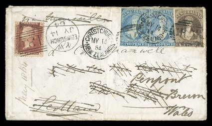places (6d. repaired at lower right) twice cancelled with ch.ch.1864 (14 May) envelope (complete with contents including a Return of Sheep) from Christchurch to Edinburgh, bearing 2d. blue, Plate 1, worn (2) and 6d. brown with margins in places (6d. repaired at lower right) twice cancelled with "ch.ch." duplex, upon arrival redirected to Brecon, Wales with addition of 1d. red Plate 88 cancelled with "131" duplex (14.7), various UK transit c.d.s. on reverse. An unusual redirected franking. Sc. 12g, 14e; S.G. 38, 42. (Image) Est. $500-750