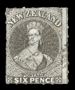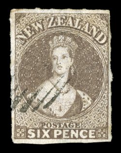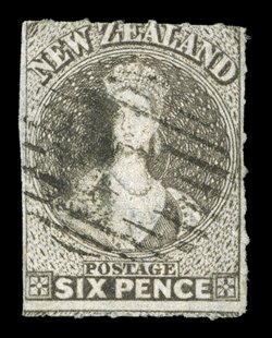 6d. black-brown, a huge example with large margins on all sides, roulettes at foot and with traces elsewhere, neatly cancelled "1" at Auckland; diagonal crease not