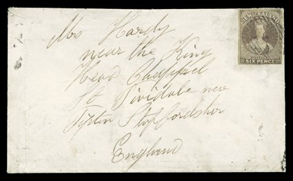 very lightly cancelled, fine despatch c.d.s. alongside, the rever1863 (9 Mar.) small envelope from Lyttelton "Via Southampton" to Haverford West, Wales, bearing 6d. black-brown with good to large margins nearly all round, placed sideways and very lightly cancelled, fine despatch c.d.s. alongside, the reverse with Christchurch (9.3) and arrival (22.3) c.d.s.; a fine and scarce stamp on cover. Holcombe Certificate (1993). Sc. 24; S.G. 85. (Image) Est. $1,000-1,500