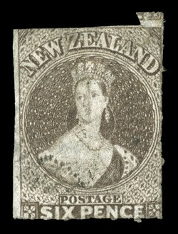 S.G. 88, £485.6d. black-brown, a small example showing traces of roulettes and eccentrically severed at upper right corner, lightly cancelled, sound. R.P.S.N.Z. Certificate (1969). Sc. 24b; S.G. 88, £485. (Image) Est. $150-200