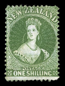 foot and partially reperforated at right. An exceptionally rare stamp.1/- deep green, unused without gum and quite well centered for this notoriously difficult stamp; some slight staining although the color remains strong, a few pulled perfs. at foot and partially reperforated at right. An exceptionally rare stamp. Holcombe Certificate (1988). Sc. 25a; S.G. 94, £13,000. provenance: Charles Lathrop Pack, December 1944, F.C. Krichauff, November 1947 (Image) Est. $1,000-1,500