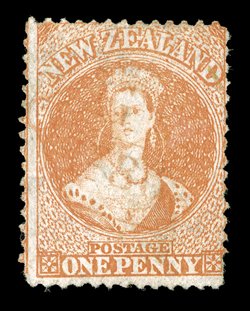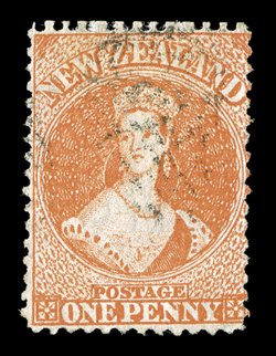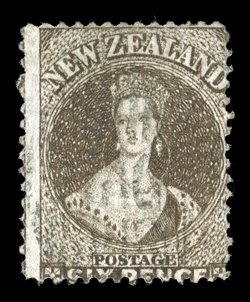 and presentable example of this very rare stamp of which very few exa6d. black-brown, a well-centered example with perforations on three sides and imperforate at top, cancelled "1" at Auckland; lower left corner a little rounded, otherwise sound and presentable example of this very rare stamp of which very few examples are recorded. Sc. 24c; S.G. 95, £5,500. (Image) Est. $3,000-4,000