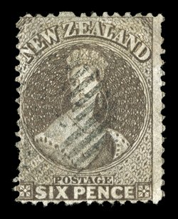 provenance: Gerald Ellott6d. black-brown showing Row 17/10 re-entry, neatly and lightly cancelled with part Otago duplex and traces of a red cancellation; fine and unusual. Sc. 24a; S.G. 93, £400. provenance: Gerald Ellott (Image) Est. $150-200
