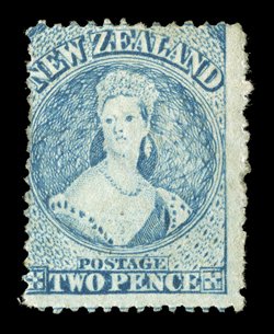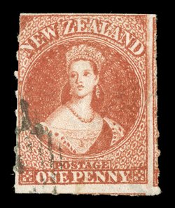fine appearance for this rare stamp. R.P.S. Certificate (1945). Sc. 27a1d. carmine-vermilion with roulettes on three sides and imperforate at right giving a well-balanced appearance, clearly cancelled "1" at Auckland; thin at left side though of fine appearance for this rare stamp. R.P.S. Certificate (1945). Sc. 27a; S.G. 101, £3,000. provenance: C.W. Meredith, March 1960, Charles Williams, November 1947, Harry Lacoste Bartrop, October 1984 (Image) Est. $500-750
