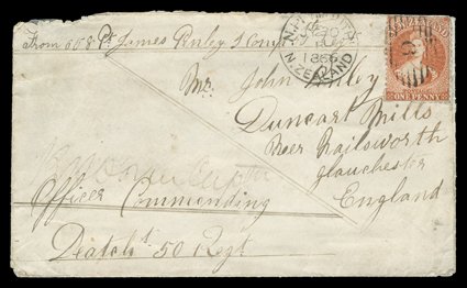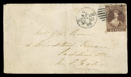 each cancelled with 1 duplex and showing manuscript 6 in red cr1869 (16 Mar.) entire from Auckland to Gotha carried on the Panama and New Zealand Royal Mail Steam Company's "Ruahine", bearing 2d. deep blue Plate II pair and 6d. red-brown each cancelled with "1" duplex and showing manuscript "6" in red crayon, London Paid c.d.s. (3.6), oval-framed "PD" in red, unframed "P.D." and "(aus england per aachen)/franco" double-ring d.s. (4.6) in blue, the reverse with part sender's cachet and Gotha c.d.s. (5.6); the entire strengthened internally on folds and with other faults, though a very unusual late use of the via Cape Horn route after 1860. R.P.S. Certificate (2006). Sc. 32, 36; S.G. 114, 122. provenance: John Woolfe, October 2006 Note: The "Ruahine" had completed her last run on the Panama route and was returning to the U.K. via Cape Horn, and the opportunity was taken for a special mail service leaving Wellington on 30 March. (Image) Est. $750-1,000