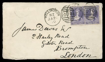 (13.5), all on face, despatch, Nelson (18.3) and Locarno (1872 (15 Mar.) envelope from Hokitika to Locarno, bearing 3d. lilac (3) each cancelled with large capital "W" and showing manuscript "3", circular-framed "PD" and London Paid c.d.s. (13.5), all on face, despatch, Nelson (18.3) and Locarno (17.5) c.d.s. on reverse; to stamps with defects and the reverse with a few small faults though an attractive franking. R.P.S. Certificate (2002). Sc. 33; S.G. 117. (Image) Est. $3,000-4,000