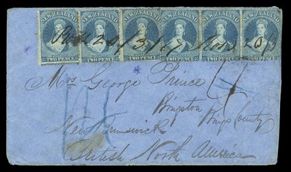 reverse, Hoikitika (21.3), Christchurch (22.3), St.1867 (20 Mar.) blue envelope from Ross to Kingston, bearing 2d. deep blue Plate II (6) twice cancelled "Ross 20/3/67" in manuscript, rated "4" and "14" in blue crayon and showing, on reverse, Hoikitika (21.3), Christchurch (22.3), St. Thomas (1.5) and Kingston (13.6) c.d.s.; the envelope internally reinforced and the stamps with faults in places, lifted and replaced slightly out of position. A rare franking to an unusual destination. R.P.S. Certificate (2000). Sc. 32; S.G. 114. provenance: Major Henry Dumas, March 2000 (Image) Est. $1,500-2,000