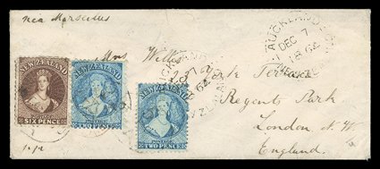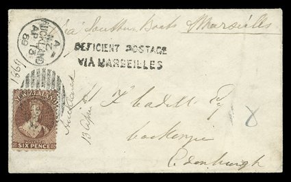 underfranked by 2d. and upon arrival rated 8 (additionally tying the1864 (8 June) entire from Auckland to London, bearing 2d. pale blue Plate I worn in combination with imperforate 6d. red-brown and G.B. 1d. red Stars twice cancelled "1", underfranked by 2d. and upon arrival rated "8" (additionally tying the 1d.) and "8d" (deleted) and showing circular-framed "more/to/pay" h.s. and light "deficient postage /fine " completed for "2d" and "6" respectively, the reverse with despatch and arrival (15.8) c.d.s.; two filing creases, one of which crosses the 2d. value, nevertheless a very rare and unusual franking. Sc. 14, 32a; S.G. 43, 13. (Image) Est. $1,500-2,000