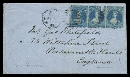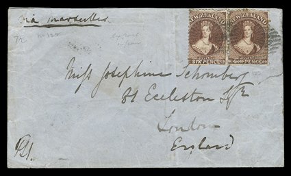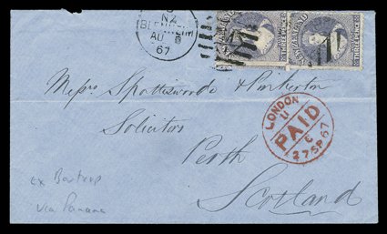a further London c.d.s. (29.11) on reverse. Signed Holcombe. Sc. 361866 (5 Sept.) blue envelope from Dunedin to London, bearing 6d. red-brown pair and a single twice cancelled with "0" duplex and showing London Paid c.d.s. (29.10) in red below, a further London c.d.s. (29.11) on reverse. Signed Holcombe. Sc. 36; S.G. 122. (Image) Est. $300-400